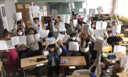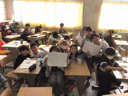 3年生の算数科では、コンパスを使って正三角形や二等辺三角形を描く方法を学習しました。描き方を学んだ子どもたちは、さまざまな三角形を描くことにチャレンジ。小さな小さな三角形を描く子や、三角形を組み合わせて楽しい模様をつくる子など、練習を楽しんでいました。すっかり、三角形マスターになったようです。