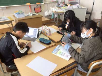 5年生の社会科「自動車をつくる工業」の学習では、自動車のよさを伝えるCM作りに取り組んでいます。グループでどんなCMにするかを話し合い、絵コンテを描きました。初めての絵コンテ作りに、ワクワクがとまりません。完成が楽しみです。