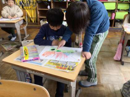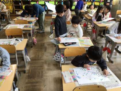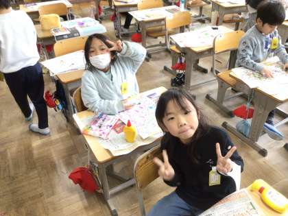 1年生は、図工の授業でマジックを使いながら「せんのぼうけんのえをしあげてあそぶ」学習を行いました。子どもたちは、色々な色のマジックを使って、様々な線を描きながら模様や絵を作成しました。「私は、迷路を作ったよ。色によって通れるところを分けるのが難しかったけど、楽しかった」「僕はハリネズミを描いたよ。赤の線でハリを描くのが楽しかった」などと話してくれました。完成後、友達と絵を見せ合いながら楽しく学習しました。