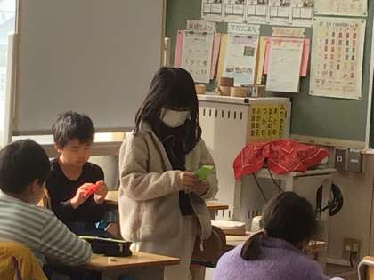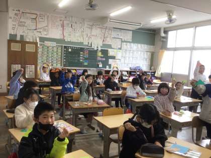 「折るだけで二等辺三角形ができるなんてびっくりした」「正三角形は難しかった。みんなに作り方を説明できてうれしかった」などの感想がありました。楽しみながら図形についての理解を深めました。