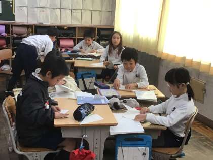 3年生の3クラスが紙を折って二等辺三角形や正三角形を作る学習をしていました。個人やグループで追究し、できた子は、どうしてそう折ったのかをクラスの子に伝えていました。