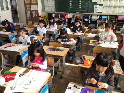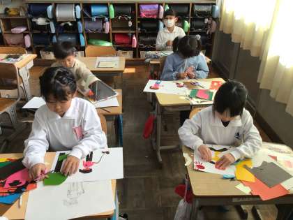 2年生は、図工の授業でカラー版画も制作をしました。下書きを元にして中心となる人や、周りの背景のパーツをつくりました。背景にスカイツリーをつくった子、跳び箱を跳んでいる様子をつくった子、海で泳いでいる感じをつくった子など、どの子も個性的な版画を制作しました。「小さな犬をつくるには、細かなパーツを組み合わせるといいよ」「版画だから、字や数字は反対に書かなきゃいけないね」など、友達にアドバイスしながら制作に没頭しました。子どもたちにとって版画は初めてなので、どのような絵が完成するか興味津々でした。