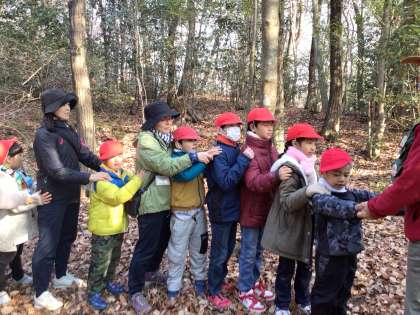 トヨタの森では冬の自然に触れ、たくさんの体験をしてきました。カマキリの卵やヤゴを見つけたり、落ち葉で遊んだり、坂を転がったりしました。落ち葉を布団にすると温かいことに気づき、虫たちが冬眠している様子を体験しました。いろいろな活動を通して、冬の自然についてたくさんのことを学びました。