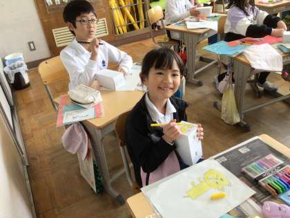 1年生の図画工作科「スルスルビューン」の学習では、滑る仕組みを使って、滑らせたい物を作っています。