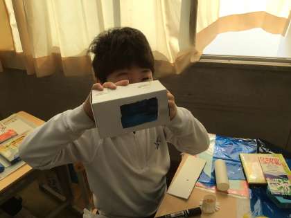 今日は、前の授業でかいた設計図を見ながら、ペンや折り紙を使って自分だけのロープウェイを作りました。穴にセロファンを貼って透けるようなロープウェイを作る子や動物の形をしたロープウェイを作る子など、それぞれいろいろな工夫をしていました。完成したロープウェイを滑らすのが楽しみですね。