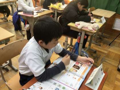 5年生の英語科の授業では、職業の言い方を勉強していました。singerやcomedeianなど普段よく聞く単語だけでなく、mountaineerやresearcherなど、初めて聞く言葉もありました。子どもたちは自分の憧れの職業の言い方が知りたいと意欲的に取り組んでいました。
