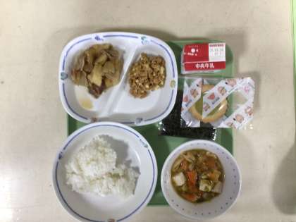 今日の給食は、博物館献立です。豊田市博物館では、4月6日(日)まで市内の様々な郷土料理が展示され、その一つに学校給食も展示されています。今日の献立には、昭和50年頃に考えられたチーズが入っている納豆あえ、豊田市産の小麦「きぬあかり」、米「大地の風」、茶を使用したひまわり型クッキーがありました。この納豆あえは、全国的にも珍しいメニューであり、博物館に展示されています。