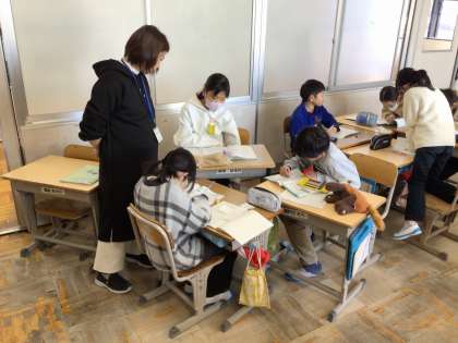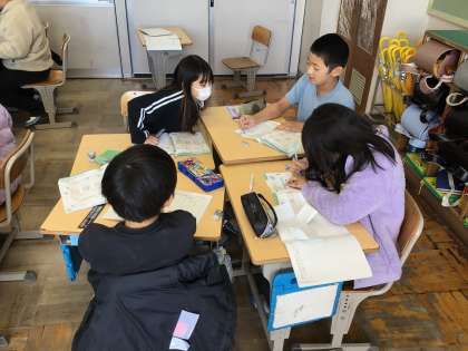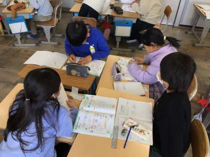 4年生は、算数の授業で直方体を辺に沿って切り開いて平面に広げた図の作成に取り組みました。グループで話し合いながら考えました。「縦と横の長さを正確に計って書くことが大切だね」「向かい合っている面の形を同じにする必要があるね」などと説明することを通して、分からない子も理解することができました。友達と学び合うことを通して、学習課題に迫り、課題を解決する達成感を味わうことができました。