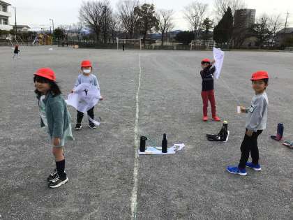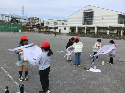 1年生が、運動場で凧揚げをしました。最初は2人1組でやる予定でしたが、今日は風が強く、手を離した瞬間に凧が空に舞い上がり、みんな大慌てでした。糸が切れてしまったり、友達の凧とからまったり、ハプニングが続出しましたが、だんだんと上手にあげられるようになり、授業の後半になると、凧揚げを思い切り楽しむことができました。