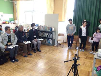 あすなろ学級は、1年間総合的な学習の時間で追究してきた成果を、調査にご協力いただいた博物館の学芸員さん、水土里ネット豊田の職員さんに披露しました。博物館の学芸員さんからは、「カダヤシをどうしたらいいかという問題は、とても大切な問題ですね。メダカとカダヤシがどうすれば共存できるか考えていくことも必要だと思います。新たな問題提起をありがとうございました」、水土里ネット豊田の職員さんからは、「この地域にいるメダカが外来種だということを聞いて驚きました。この調査結果はとても参考になりました。ありがとうございます」といった驚きとともに、賞賛のお言葉をいただきました。感想を聞いた子どもたちは、「緊張したけど、『すごい研究をしたね』と言われてうれしかった」「一生懸命調査したことを褒めてもらえてうれしかった」などの感想をもちました。地域をよりよくしたいという思いが伝わるすばらしい探究学習でした。