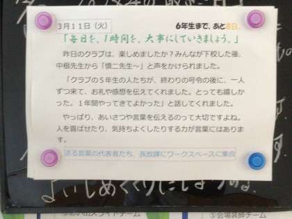 5年生の廊下に、写真のような掲示物が貼ってありました。昨日、学年主任の先生が他学年の先生から聞いた「クラブが終わったときに、5年生が1人ずつ来て、お礼や感想を伝えてくれて嬉しかったよ」というエピソードが紹介されていました。5年生の素直さが感じられるエピソードですね。先日の「6年生を送る会」で6年生から校旗を受け取ってから、5年生の意識もずいぶん変わっているようです。授業にも真剣に取り組んでいます。