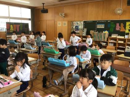 1年生が合奏で子犬のマーチの合奏の練習をしていました。