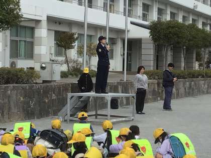 下校集会には豊田警察署の方が来てくださり、「登下校中に困ったことがあれば、こども110番の家に飛び込んだり、周りの大人に助けを求めたりしていいんだよ」とお話をしていただきました。