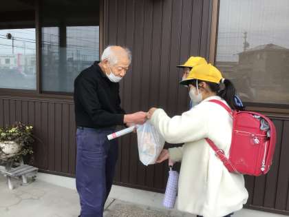 こども110番の家では、6年生が作った花の寄せ植えと新しい安全マップを届け、「これからも私たちの安全を見守ってください」と感謝の気持ちを伝えました。110番の家の方からは、「これからも交通安全に気をつけてね」「何かあったら声をかけてね」とお返事をいただきました。