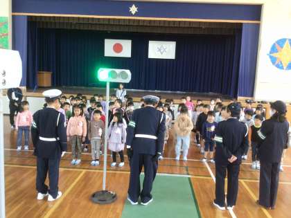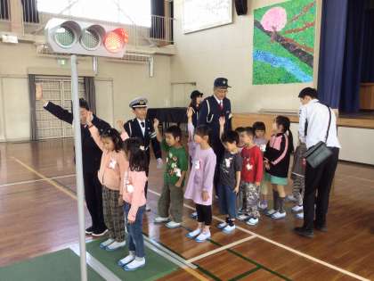 1年生のために、地域の交通指導員さんたちが交通安全教室を開いてくれました。代表の子が大きな挨拶をしてくれたので、みんなもとても上手に挨拶ができました。