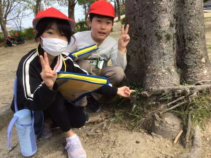 2年生の生活科「春はっけん」の学習では、みんなで校庭を歩き回って春をたくさん見つけました。