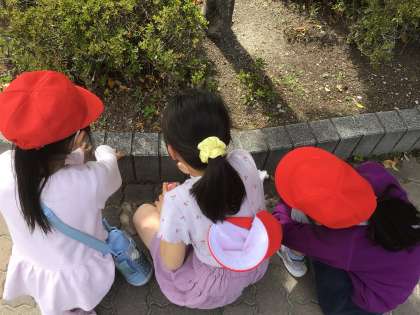 「長放課も童子山タイムも汗をかいたのに、また汗をかいちゃった」と言って、水筒のお茶をごくごく飲みながら、花びらを拾ったり、虫を見つけたりしていました。これから、見つけた春を使って遊びを広げていきます。