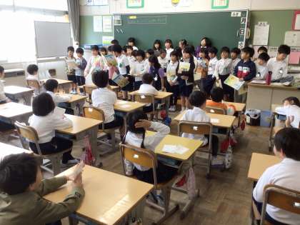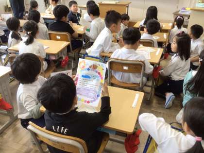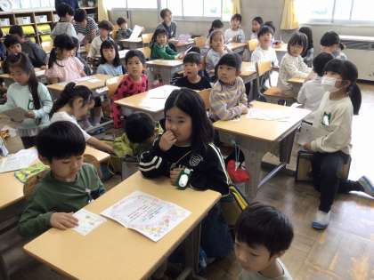 今日は、2年生が1年生の教室を訪問し、ペアになる子と顔合わせを行いました。2年生が招待状を渡すと、1年生からは名刺のプレゼントがありました。その後は、自由におしゃべりタイム。緊張している1年生に、2年生は「学校は楽しい?」「学校探検で、どんなところが見たいの?」などと優しく声をかけていました。授業の終わり頃にはすっかり仲良くなり、1年生も学校探検が待ち遠しくなったようでした。