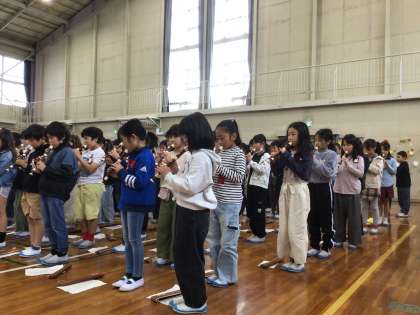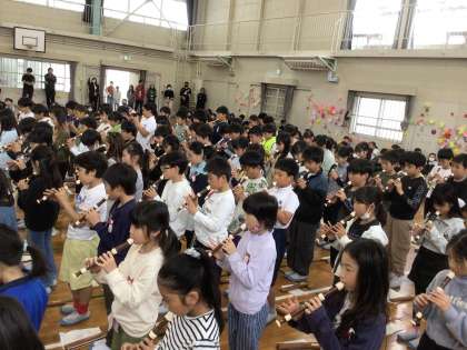 4年生はからは、リコーダー演奏のプレゼントがありました。たった1年間で、これだけ上手なるのだと感心させられるくらい綺麗な音色を響かせていました。「童子山小学校は温かい学校だよ。わからないことは何でも聞いてね」のメッセージに、1年生は大きくうなずいていました。