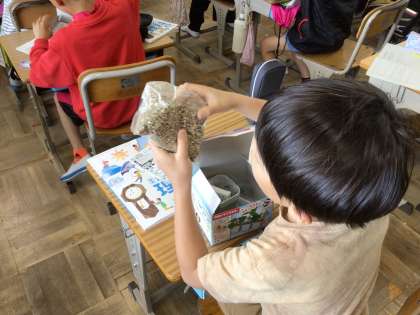 5年生の理科「植物の発芽と成長」の学習で、発芽に必要なものを予想していました。「土がいるんじゃない?」「でも脱脂綿みたいなものから芽が出ているのを見たことがあるよ」と経験と学習を結びつけて意見を言っている子がいて感心しました。また「空気がいるよ!」という意見に対して「勇気!」「元気!」など、面白い意見を出して教室の雰囲気を和ませている子もいました。これから、実験をして、発芽に必要なものを見つけていってくださいね。