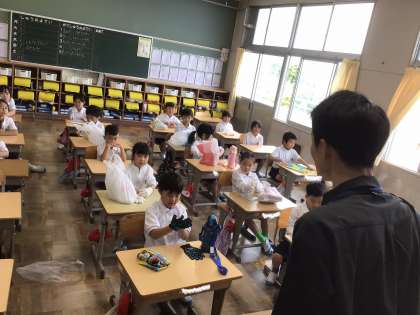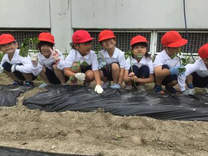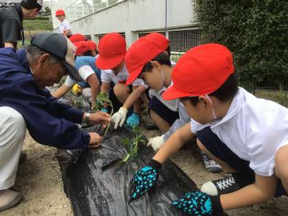 1年生が、農業指導員さんに教えてもらいながら、さつまいもの苗を植えました。「芋掘りはしたことがあるけど、苗を植えるのは初めてだよ」「これがあんなに大きなさつまいもになるなんてびっくり!」などと言いながら慎重に植えていました。大きなさつまいもができるといいですね。