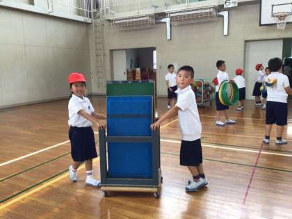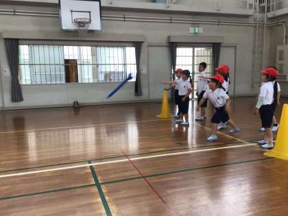走る、投げる、跳ぶを組み込んだサーキットトレーニング。「もう、4周もしたんだよ」と汗を拭きながら教えてくれる子がいました。ロケット状の筒を投げる時には、「斜め上を意識して投げるといいよ」という先生のアドバイスを受け、みんなどんどん遠くへ跳ぶようになりました。片付けもみんなで協力してさっと行う素敵な2年生です。体力テスト頑張ってくださいね。