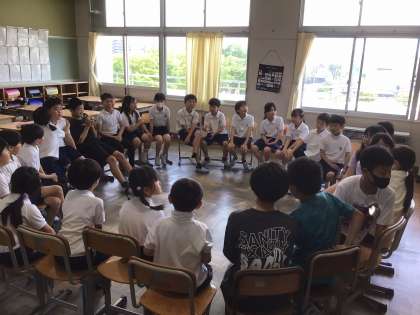 今日の目的は、メンバーの名前を覚えること。「私は誰でしょうクイズ」や「名前と好きなものしりとり」をしたり、好きなものを言いながら爆弾ゲームをしたり、6年生が考えた遊びをみんなで楽しんでいました。