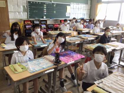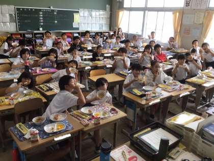 4年生の給食の準備が素晴らしくてびっくりしました。時間になると全員がさっと動き出し、声をかけ合いながら、それぞれの役割を果たしていました。あっという間に準備が完了し、餃子・いためビーフン・ミックスフルーツ・米粉パン・牛乳を美味しそうに頬張っていました。最後の写真は、自分の好きなものを見せてくれています。ビーフンが人気のようです。