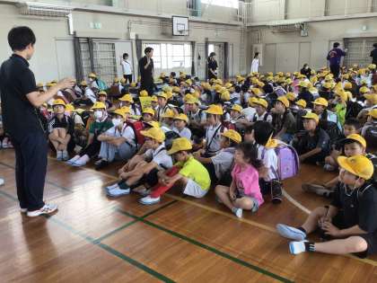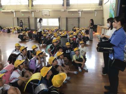 今日の下校時にミニ通学団会がありました。気温が高くなってきたので、クーラーの効いた体育館で行うことにしました。短い時間でしたが、前よりもよくなったことや困っていることなどを話し合いました。帰る前には水分補給を行い、マスクを外すことを確認してから下校しました。