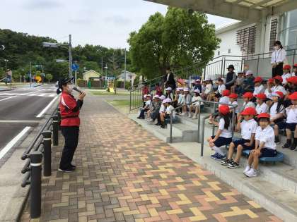 次は、屋外にに移動して飛び出し実験を見ました。道路へ飛び出すことの危険性を実感する時間となりました。「道路へは飛び出しません」という大切な約束をみんなで声に出しながら確かめました。