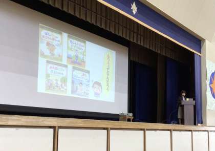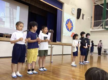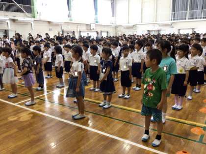 今日の全校集会では、5月に実施した父母教師会主催の交通安全教室で優秀な感想を書いた子の表彰があり、6人の子が記念品をもらいました。また、校長先生は「ひかり、あじ、おとがイタイんです」という絵本の読み聞かせをして「『普通』は人の数だけあるのだから、今のあなたのままでいいんだよ。そして、周りのお友達をありのまま受け入れられるといいね」などのメッセージを伝えていました。子どもたちは真剣に聞いて、自分の生活振り返っているようでした。