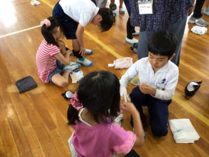 3年生が、社会福祉協議会の方々をお招きし、高齢者擬似体験をしました。ペアになり、1人は様々な装具をつけて高齢者の不自由さを体験しました。もう1人は、相手を高齢者だと想定し、優しく声掛けをしたり、体を支えたりして、介助の体験をしました。