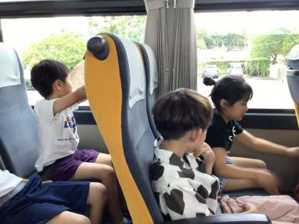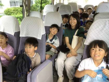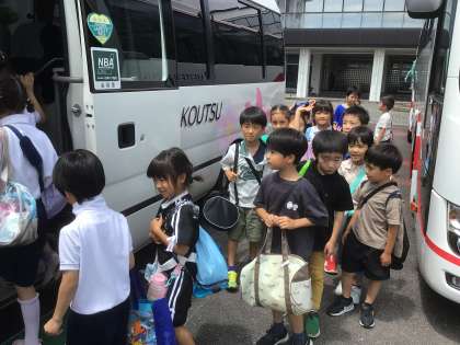 1年生にとって、初めての水泳学習がありました。バスに乗って近くのスイミングスクールに出かけますが、バスに乗るときは「お願いします」と元気に挨拶をすることができました。