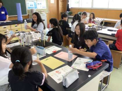 4年生の社会科の学習の一環として、豊田市上下水道局の方を講師にお招きし、下水道講座を行いました。洗濯やお風呂、トイレなど家の中で使われた水は、下水道の管を通って流れていて、下水処理場に運ばれます。汚水は、学校のプール2000個分の水と微生物の力を使ってきれいににするそうです。また、ティッシュペーパーとトイレットペーパーのどちらが早く水に溶けるのかの実験をしました。ティッシュペーパーは水になかなか溶けず形が残りましたが、トイレットペーパーはあっという間に水に溶けました。ティッシュペーパーだけでなく、油など水に溶けないものを流すと、下水道管が詰まって大変なことになるそうです。清潔で快適な町づくりのために、自分たちができることを考える機会にもなりました。