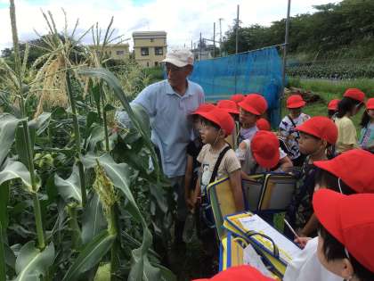 畑では「トウモロコシが、自分の背よりも高くなっているよ」「ナスは、水がたくさん必要なんだね」などと、話しながらじっくりと野菜を観察しました。さらに、農業指導員の方にインタビューをして、「虫がついていたら、どうしたらいいでしょうか」などと、悩みの相談にものっていただきました。今日教えてもらったことをこれからの栽培活動に生かしていきます。