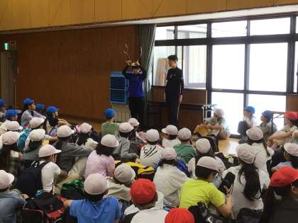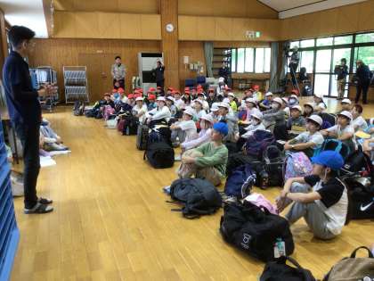 入所式では、可愛らしい鹿が登場し、所長さんから「自然をいっぱい感じて、普段できないことにいっぱいチャレンジしてください」とのお話がありました。子どもたちは、自分たちの目標「挑〜協力・思いやり・思い出〜」を大きな声で唱和し、決意を述べていました。