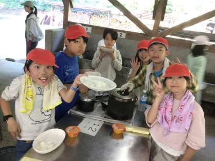 美味しいカレーを食べた後には、遅れた時間を取り戻そうと、学年全員で片付けをしました。自分の班だけでなく遅れている班の手伝いを積極的にする姿に、目標の一つ「協力」を感じました。