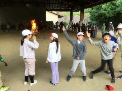 カレーを食べ、夕べの集いを行った後には、いよいよキャンプファイヤーです。時間をかけて準備をしてきたので、子どもたちのテンションも上がっています。