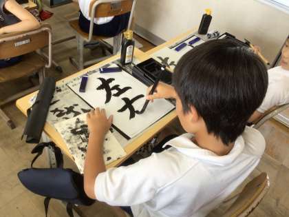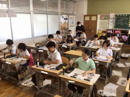 休み時間はとっても元気な4年生ですが、週に1時間の書写の授業では、心を落ち着かせて真剣に文字と向き合うようにしています。学年が上がるにつれて、だんだんと文字も難しくなってきましたが、筆を立てて書くことを意識してがんばっています。