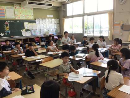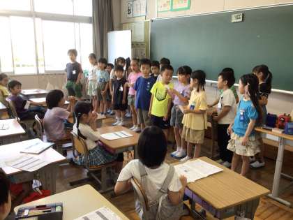 そこで1年生は、朝の会の時間に、アサガオでどんな遊びができるのかを2年生に聞きに行きました。2年生からは、「葉っぱのこすりだし」「押し花」「色水」「色水を使って紙染め」を教えてもらいました。さらに「困ったことがあったら、いつでも相談にきていいよ」と優しい言葉までかけてもらいました。これから1年生は、教えてもらったことを参考にして、アサガオでさまざまな遊びに挑戦していきます。
