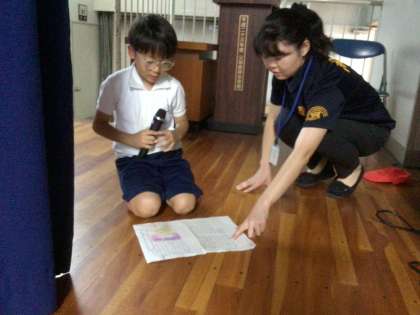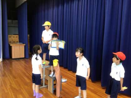 2年生が体育館で劇の発表をしていました。国語科「名前を見てちょうだい」の学習として、お話の続きを自分たちで考え、それをみんなで劇にしたそうです。ロナウドが出てきたり、ゴジラが出てきたり、楽しいお話に仕上がっていました。子どもたちの想像力はすてきですね。