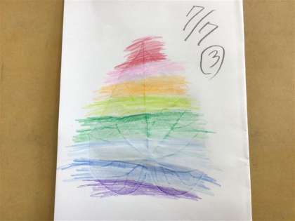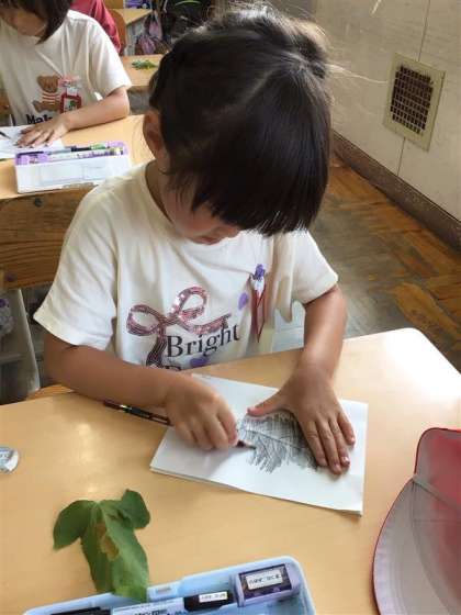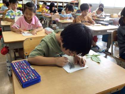 1年生が、生活科「なつとなかよし」の学習で、あさがおの葉っぱを使って葉っぱのこすり出しにチャレンジしました。はじめは鉛筆でこすり方を学び、その後は思い思いのこすり方であさがおあそびを楽しみました。個性あふれる作品がたくさんできました。