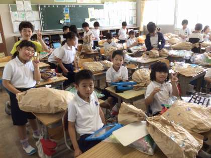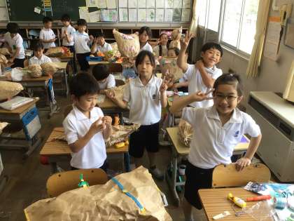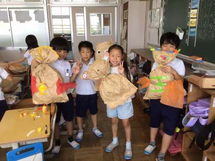 2年生の図画工作科「くしゃくしゃぎゅ」の学習では、紙をくしゃくしゃにしてお友達を作りました。家から飾りたいものを持ってきて、「楽しい!」と言いながら夢中になって自分だけのお友達を作っていました。お友達の名前にちなんで、胸に「王」という文字を作ったり、羽をつけたり、子どもたちの発想力には驚かされます。