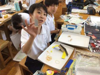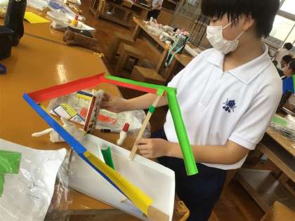 5年生の図画工作科「ビー玉のぼうけん」の学習では、板を電動糸のこぎりで切り分け、その形からビー玉で遊べるものを作っています。初めて「電動糸のこぎり」を使う子どもたちでしたが、先生の話をしっかり聞いて、安全に思い通りの形に切ることができました。これから、どんな作品に仕上げていくのか楽しみです。