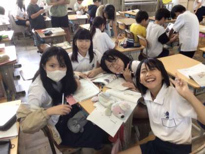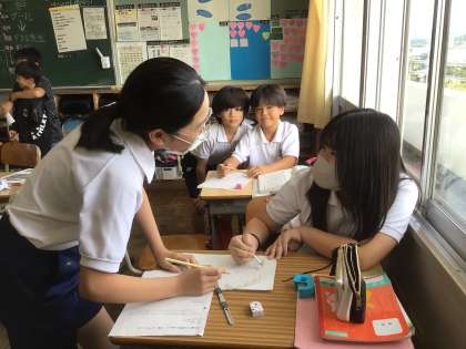 5年生の国語科の学習では、夏休みの思い出を短歌にしていました。短歌は五・七・五・七・七のリズムで表現される短い詩です。子どもたちは、出来事をそのまま詩にするのではなく、擬人化するなどちょっぴり工夫をしていました。出来上がった短歌をお互いに読み合うと「〜の部分がいいね〜」などと褒めあっていて、和やかな雰囲気の中、次々と作品を作っていました。