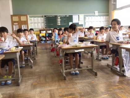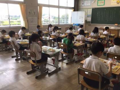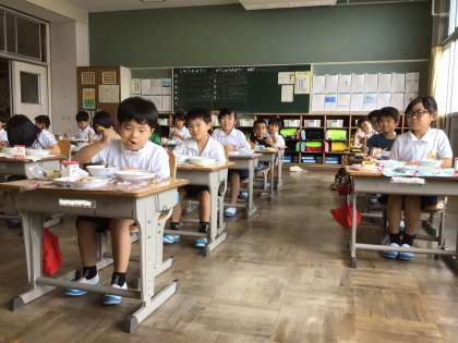 今週から保健委員会の取組として、給食の時間に全校で姿勢を意識する時間を設けました。曲が流れている間は、グー(座り方)・ペタ(足)・ピン(背中)を意識して食事をします。先週、保健室の先生と一緒に姿勢について学習した1年生は、足をしっかりと床につけて給食を食べていました。背中もピンと伸びています。1日1回でも、こうしてよい姿勢を意識できるとよいですね。