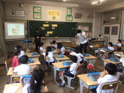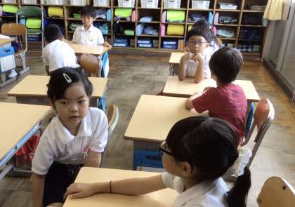 1年生の道徳では、「ひつじかいのこども」のお話を通して、正直に生きることについて考えていました。おおかみに扮した先生が教室中を走り回ると、子ども達から悲鳴があがり、嘘をつかれた村人の気持ちが実感できたようでした。先生から「なぜ嘘をついてはいけないのかな?」と聞かれると、「みんなが困るし、自分のことを信じてくれなくなるよ」と発表する子も多く、正直に生きる大切さに気づけたようでした。