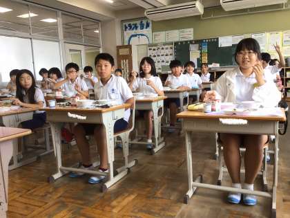 保健委員会の子が、お昼の放送で、「箸を持つ手と反対の手で食器を持つと、自然と背筋がピンと伸びます。また、日本では、茶碗やお椀などの小さな食器は手を持って食べるのがマナーです。今までやれていない人は、ぜひ今日から意識してみてくださいね」と伝えていました。この放送を聞いた後の子どもたちの様子を見に、5年生の教室に行ってみると・・・。