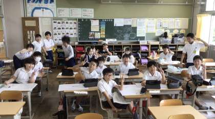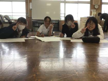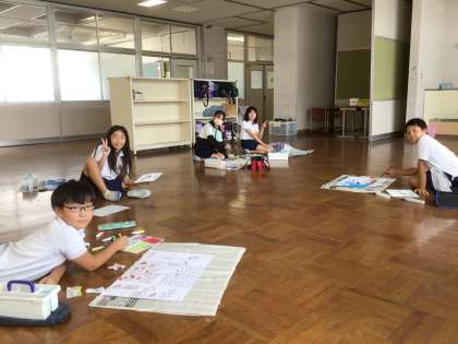 5年生は、「にじ色のさかな」の読書感想画に取り組んでいます。自由な発想を大切にしたいと、描く場所や姿勢を自由にしているそうです。みんなとても楽しそうに取り組んでいます。