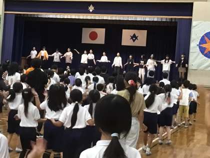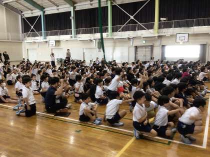 今日の「わらべちゃん」は、6年生の「しーのマン」と「ハンパンマン」と「そのファン」の3人が司会をして、「ドウジヤマックス」の発表行いました。かっこいいカリスマックスのダンスを披露した後には、「わらべっ子の絆を深めるために、運動会の閉会式で一緒に踊りましょう」との呼びかけと共に、Carrying Happinessの曲に合わせてダンスを披露してくれました。アンコールの掛け声までかかり、会場のみんなで盛り上がりました。運動会に向けてみんなも練習をして、当日、楽しく踊りましょう。